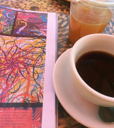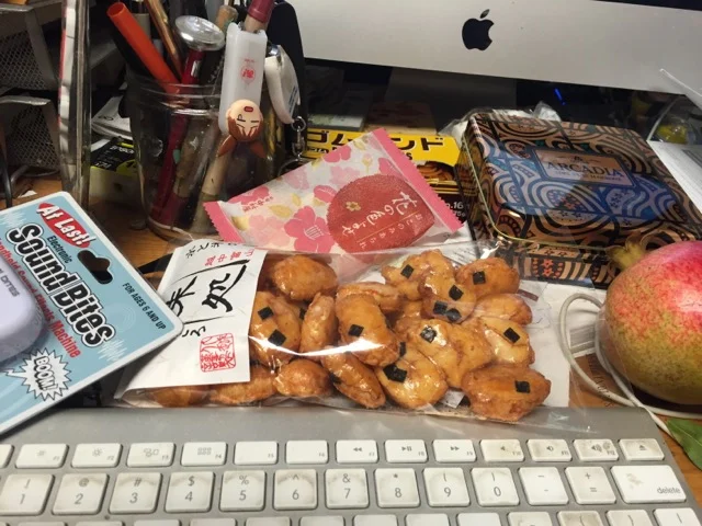日本で買ったアラレとクッキーをスタジオでポリポリ