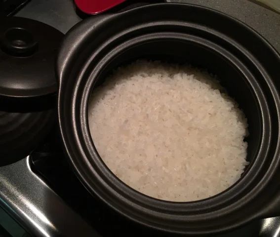 早い夕食は、久しぶりに陶器鍋でご飯を炊きました。