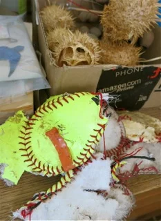 うちのミンガス(犬)が拾って、中身を出した後の野球ボール(の皮)
