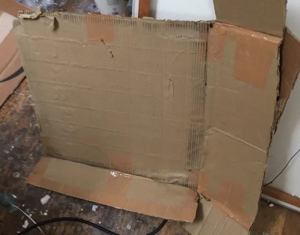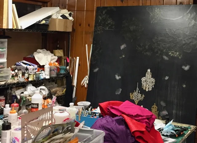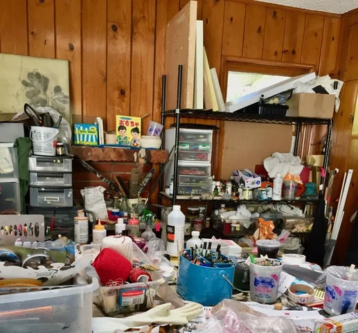 旦那と息子が仕事場をのぞきにきましたが、あまりの散らかりようを見て去って行きました。